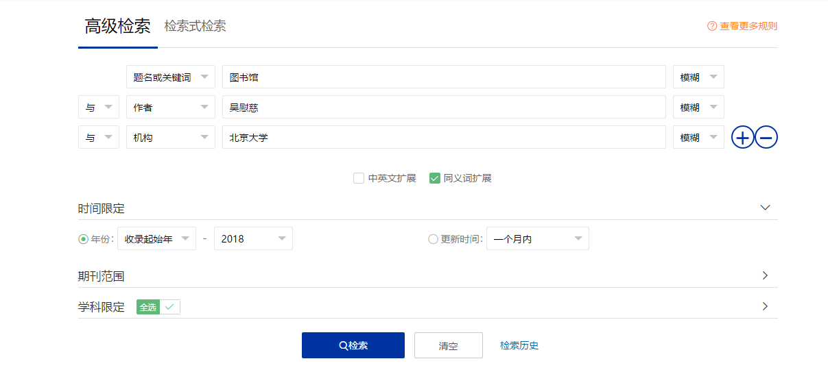 - 根据需要,选择是否进行“中英文扩展”或“同义词扩展”,同时选定检索的时间范围、期刊范围和学科范围;