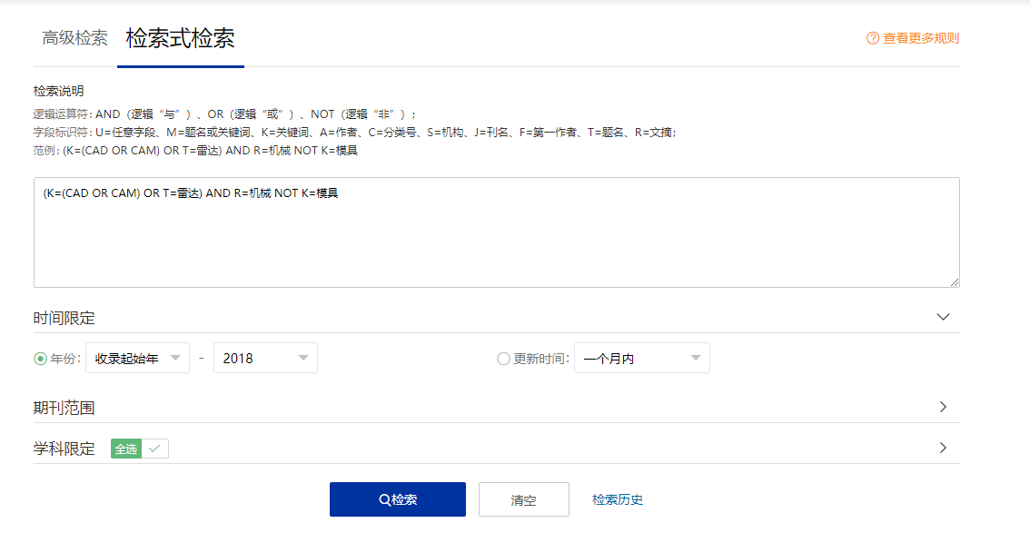 提供给专业级用户的数据库检索功能。用户可以自行在检索框中书写布尔逻辑逻辑表达式进行检索。同样支持用户选择时间范围、期刊范围、学科范围等检索限定条件来控制检索命中的数据范围。